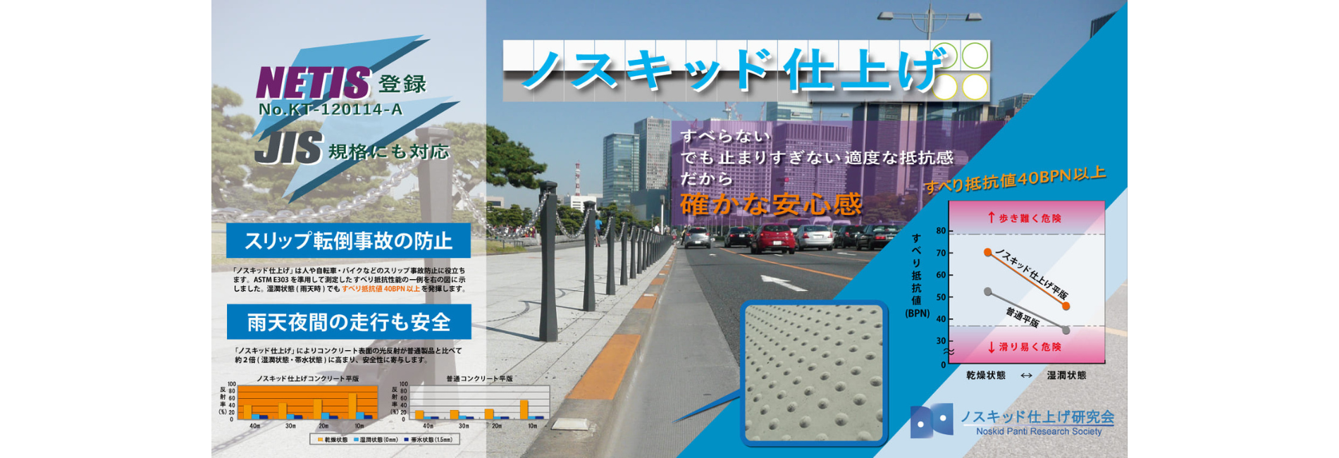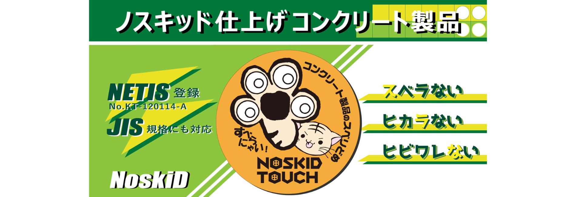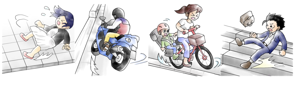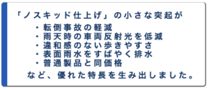 コンクリート製品の表面に滑り防止仕上げ「ノスキッド仕上げ」を施すことにより、人や自転車、バイクなどのスキッド事故を軽減することができます。